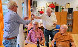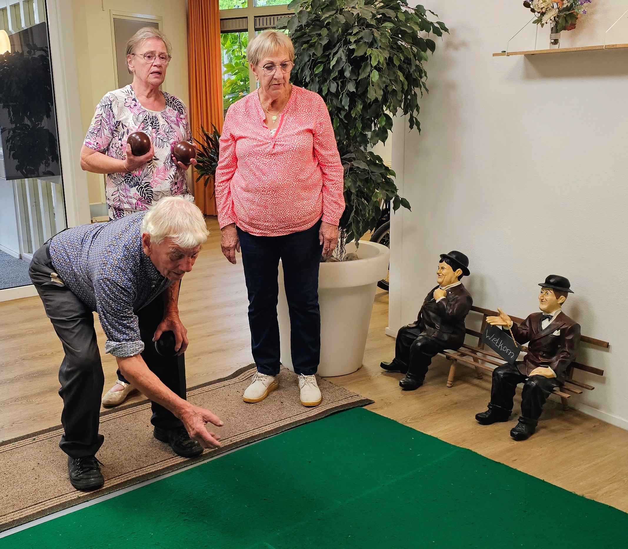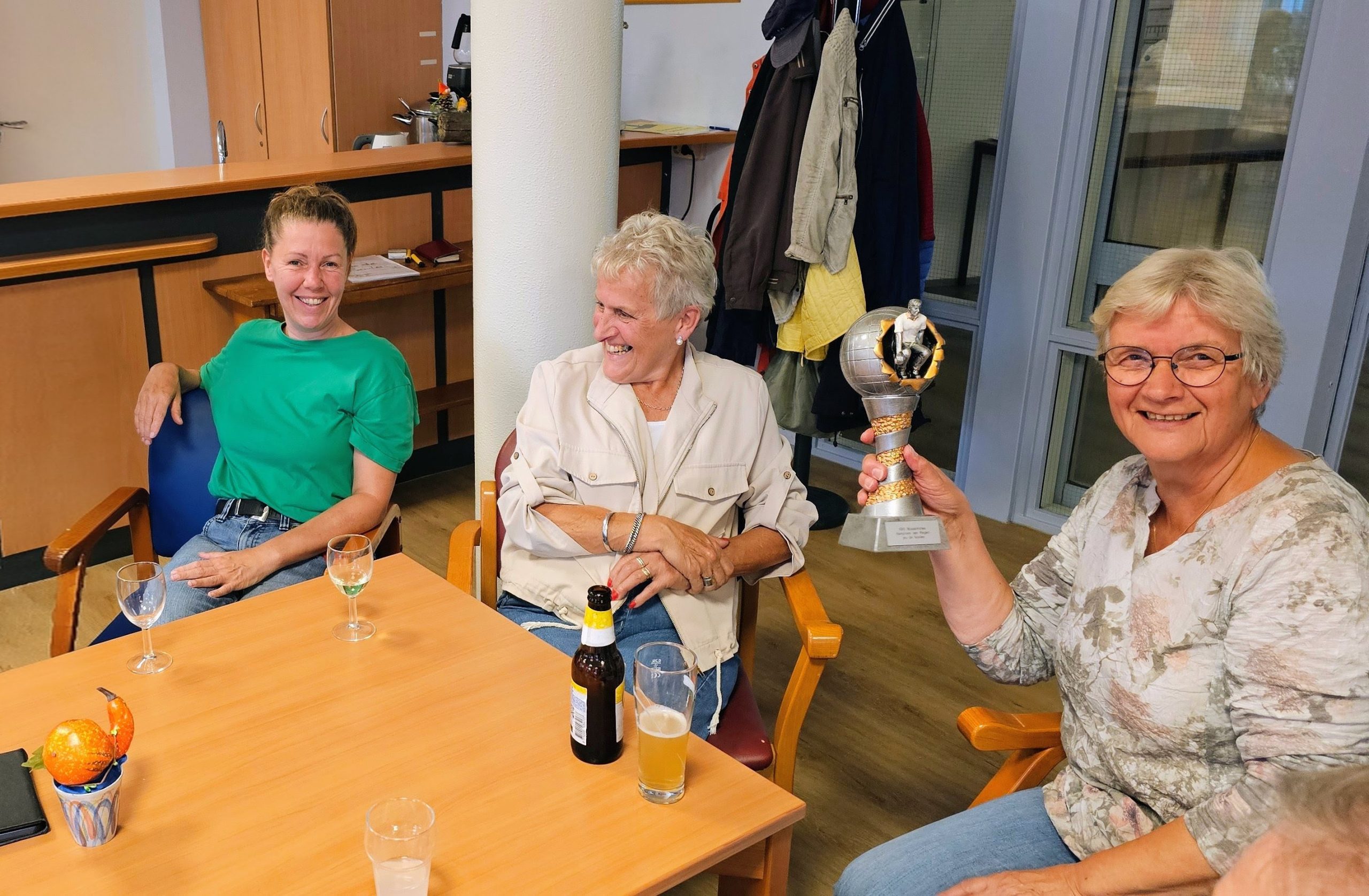 | De Jeu de Boules toernooien van KBO Megen. (9 en 10 september) Deze week werden de Jeu de Boules toernooien die vanwege de hittegolf in juli waren uitgesteld, gehouden. De weergoden hadden voor de dinsdag echter andere plannen. Het regende met bakken uit de hemel, de natuur was blij, wij echter niet. Snel werd er een alternatief bedacht en de koersbalmat werd uitgelegd. Ook de laddergolf toestellen kregen een plaats. Met excuses aan de bewoners van de Maashorst die zeker gemerkt hebben dat het wat rumoerig was. Fanatiek werd er gespeeld en al snel bleek dat koersballen een andere techniek vereist dan boulen. Veel ballen raakte buiten de mat en telden niet mee. Uiteindelijk werd het team van  Thea Schoenmakers en Riecky Wattenberg terecht winnaar en zal hun naam worden vermeld op de wisselbeker. Coby Neomagus mocht de bronzen beker ontvangen. In de laddergolf competitie ging het er ook fanatiek aan toe. De beste was Martien Derks, dit was hij ook al in 2023, blijkbaar een talent. Theo Ouwens een mooie tweede en Coby ging met de bronzen beker naar huis. Hoe anders was het weer op woensdag, stralend weer, niet te warm, niet te koud. De boulers van Megen konden hun krachten meten met de boulers uit Macharen. Macharen is altijd sterk vertegenwoordigt, helaas waren de boulers uit Haren vanwege andere KBO verplichtingen, niet van de partij. Er werd fanatiek gestreden met uiteindelijk het team met Frits v Schijndel, Riet vd Heijden en Bep van Vliet en Lies v Summeren (uit Macharen) als winnaar. In de strijd om de individuele winnaar viel Bep als eerst af, Riet vd Heijden werd derde en wederom werd een niet Megenaar de beste bouler van de oude gemeente. Proficiat voor Lies van Summeren maar ook alle eer voor Frits die zich heel lang staande hield maar zich met de zilveren beker kan troosten. Al met al weer een hele gezellige dag. |